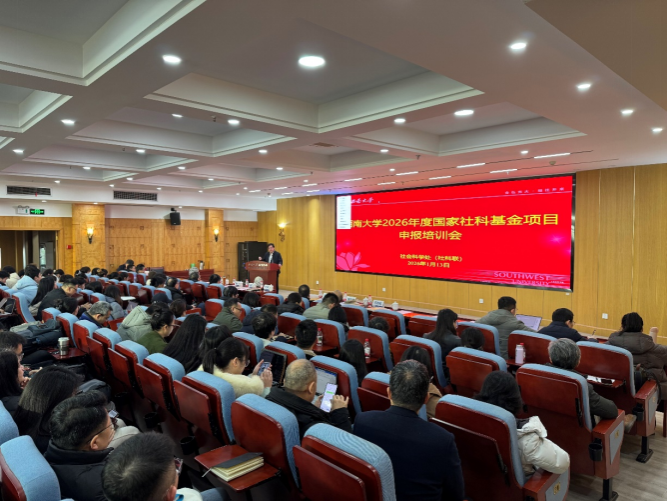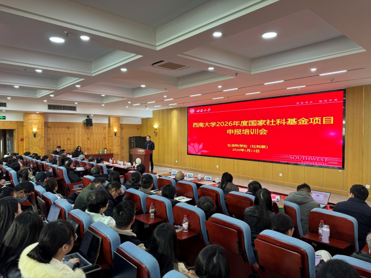 1月13日上午,学校召开了2026年度国家社科基金项目申报培训会。校党委常委、副校长邹芙都出席并讲话。培训会特邀重庆市社会科学界联合会党组成员、副主席唐旺虎,重庆市社科规划评奖办公室主任王黎明莅临指导。清华大学蔡曙山教授、华东师范大学熊川武教授、重庆大学刘渝琳教授应邀作主旨报告。校内各二级单位主管科研领导、科研秘书及广大人文社科领域科研人员230余人参会学习。会议由社会科学处处长罗超平主持。